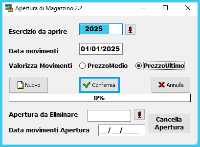 LA MASCHERA È AUTOMATICAMENTE COMPILATA CON I DATI NECESSARI, NON CAMBIARE L’ESERCIZIO DA APRIRE, NE LA DATA, è possibile cambiare solo il tipo di valorizzazione tra “Prezzo Medio” o “Prezzo Ultimo” di acquisto, quindi premere, semplicemente il tasto →”Conferma”.