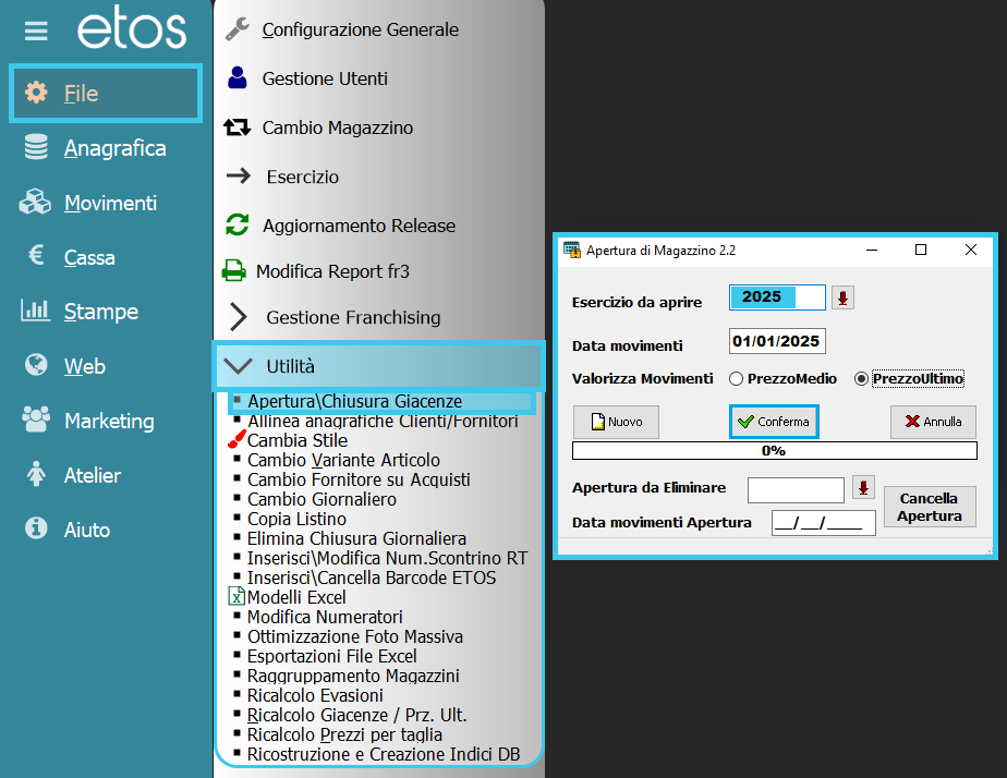 Nel →”Menù File”, →”Utilità,” →”Chiusura/Apertura Giacenze” troviamo l’utility per gestire la chiusura/apertura giacenze in autonomia. Etos lavora su due esercizi