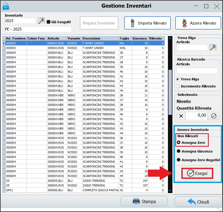 - Assegna Zero: Indipendentemente dalla giacenza attuale, assegnerà giacenza zero a tutti gli articoli non rilevati, sia che abbiano giacenza positiva, in negativo o a zero.