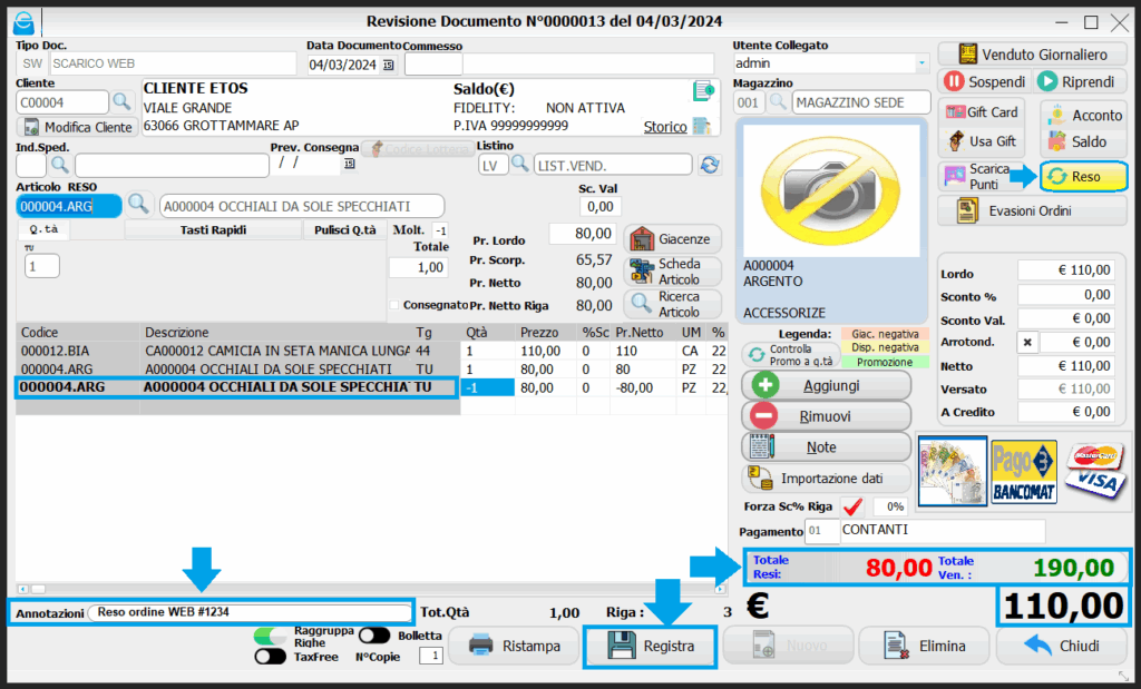 IMPORTANTE! La differenza tra il reso in negozio ed il reso di merce venduta online e che dovrà sempre essere gestito con rimborso al cliente. Per consultare la procedura di →”RESO”: CLICCA QUI