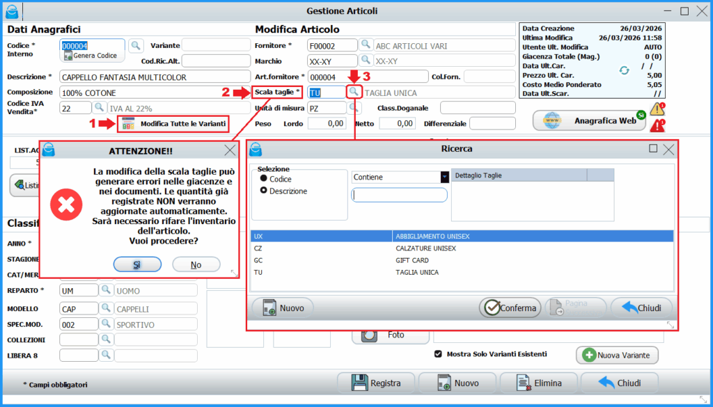 - Sul messaggio di avviso: →”La modifica della scala taglie può generare errori nelle giacenze… Vuoi procere?” cliccare su →”SI”