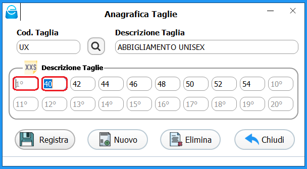 Per inserire una nuova scala taglia, se non è presente tra quelle predisposte, cliccare sul tasto →”Nuovo”, inserire un codice alfa-numerico di due cifre, nella descrizione specificare il nome della taglia che si sta creando. Inserire una singola taglia per casella senza lasciare caselle libere. Al termine cliccare sul tasto →”Registra”, per salvare.